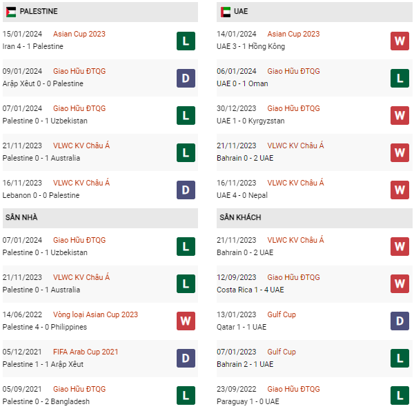 - Palestine hòa 2, thua 2 trong 4 trận gặp UAE gần đây.