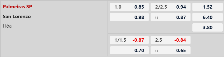 Palmeiras chỉ có được kết quả hòa ở trận đấu lượt đi trước San Lorenzo. Palmeiras thua kèo cả 3 trận đấu vừa rồi và NHM cần dè chừng với mã đầu tư này. Trong khi đó, San Lorenzo vừa có mạch 2 trận đấu không thua kèo tại Copa Libertadores.
