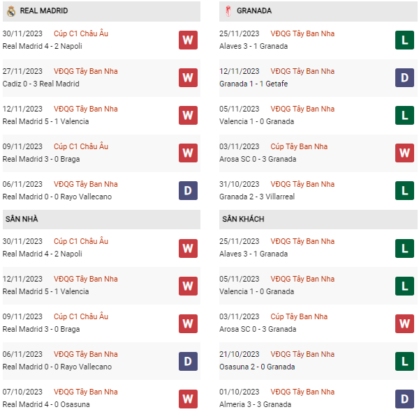 Thống kê phong độ Real Madrid vs Granada: