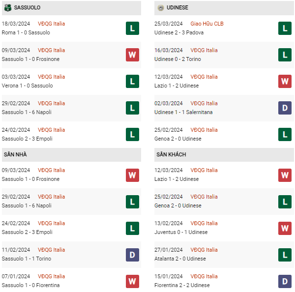 - Trên sân nhà, Sassuolo thắng 1, thua 4 trước Udinese.