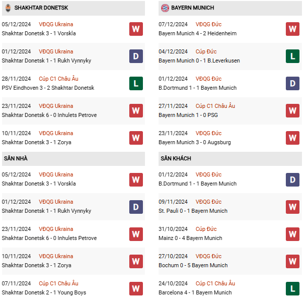 Thống kê phong độ Shakhtar Donetsk vs Bayern Munich:
