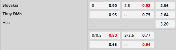 Thông tin tỷ lệ kèo Slovakia vs Thụy Điển: