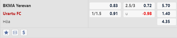 Thông tin tỷ lệ BKMA Yerevan vs Urartu:
