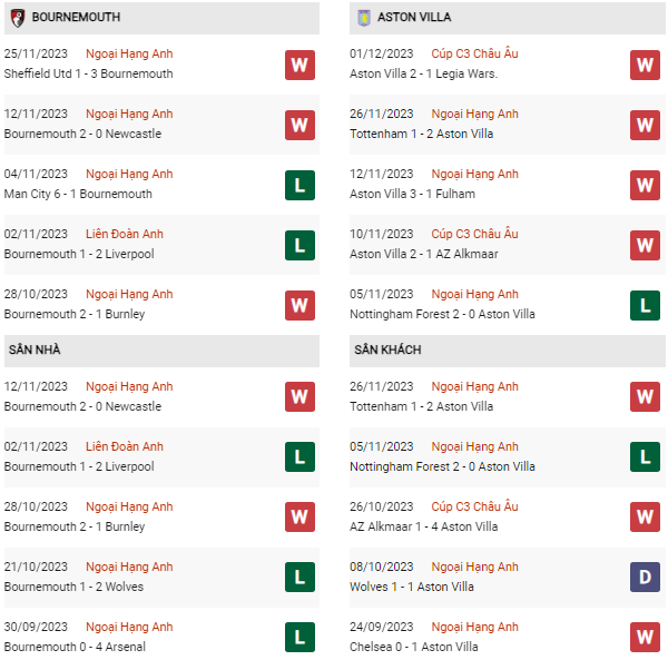 Thống kê phong độ Bournemouth vs Aston Villa: