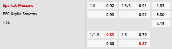 Thông tin tỷ lệ Spartak Moscow vs Krylya Sovetov: