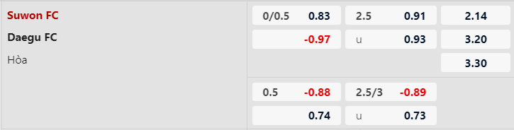 Suwon FC đang có được điểm rơi phong độ tuyệt vời khi toàn thắng kèo châu Á 4 trận liên tiếp gần đây. Trên sân nhà của mình, Suwon FC cũng mang niềm vui tới cho các nhà đầu tư châu Á 5 trận liên tiếp. Thành tích này hoàn toàn trái ngược với Daegu, đội thua kèo 3/4 trận vừa qua.