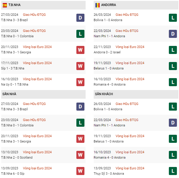 Thống kê phong độ Tây Ban Nha vs Andorra: