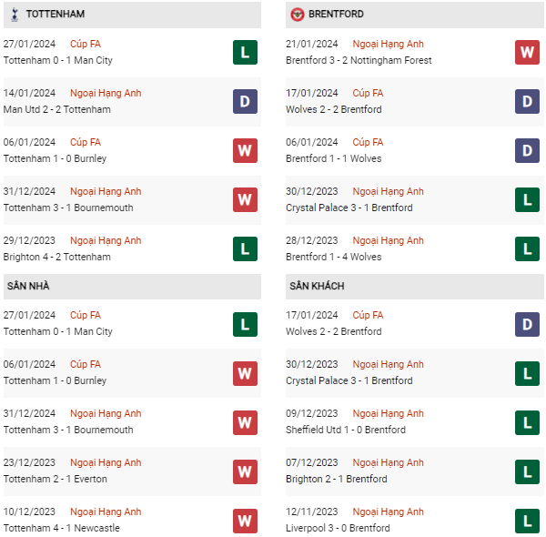 Thống kê phong độ Tottenham vs Brentford: