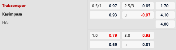 Trên sàn giao dịch, Trabzonspor được xếp chiếu trên chấp -3/4. Với mức chấp này có lẽ khiến họ thua thiệt nhưng 7 trận hành quân xa nhà gần nhất Kasimpasa chỉ thắng 1 và thua 5, cùng với việc trận đối đầu gần nhất đội khách đã thất bại cách biệt 4 bàn thì có thể cửa trên vẫn uy tín trận này.