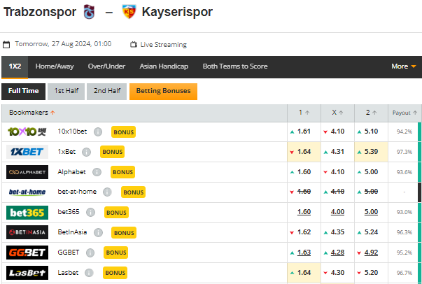 Thông tin tỷ lệ kèo Trabzonspor vs Kayserispor: