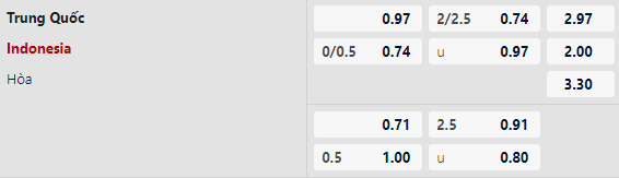 Thông tin tỷ lệ Trung Quốc vs Indonesia: