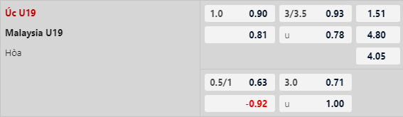 Thông tin tỷ lệ U19 Australia vs U19 Malaysia: