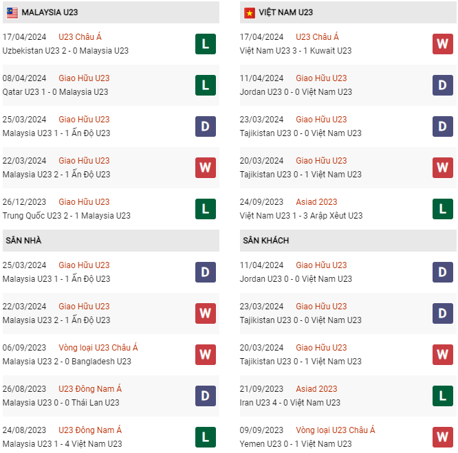 Thống kê phong độ U23 Malaysia vs U23 Việt Nam: