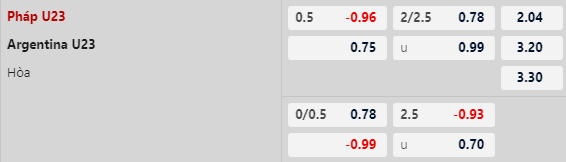 Tính đến hết loạt trận vòng bảng cùng tương quan nhân sự giữa hai đội, việc U23 Pháp được xếp kèo trên ở cuộc đấu này là điều hoàn toàn dễ hiểu. Tỷ lệ châu Á đưa ra là 1/2 bàn nghiêng về phía các cầu thủ chủ nhà. Rõ ràng với kinh nghiệm của nhóm cầu thủ ngoài 23 tuổi cùng phong độ cao của những Olise hay Marteta, rõ ràng U23 Pháp đủ sức đánh bại U23 Argentina sau 90 phút.
