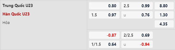 Thông tin tỷ lệ kèo U23 Trung Quốc vs U23 Hàn Quốc: