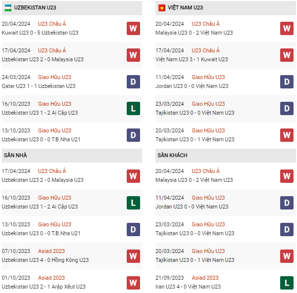 Thống kê phong độ Uzbekistan vs U23 Việt Nam: