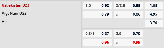 Nhà cái đang niêm yết mức kèo 0:1 và nó chứng tỏ U23 Uzbekistan vẫn được đánh giá cao hơn. Đây là sự hợp lý bởi đội bóng này thắng kèo cả 2 lượt trận ra quân đểu với tỷ số rất thuyết phục. Tuy nhiên, với việc chỉ cần 1 trận hòa là chắc chắn nhất bảng, U23 Uzbekistan tỏ ra không đáng tin với kèo chấp 1 hòa.