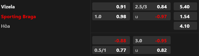 Điểm ăn ở cửa Tài 2 3/4 đã giảm từ 0.90 xuống 0.84 (tính tới sáng 8/12). Điều đó cho thấy niềm tin lớn vào khả năng trận đấu bùng nổ bàn thắng. 7/10 trận đối đầu gần đây của hai đội chứng kiến kịch bản Tài. Bên cạnh đó, 14/20 trận gần đây của Braga và 5/8 trận gần đây của Vizela trên sân nhà có nhiều bàn thắng.