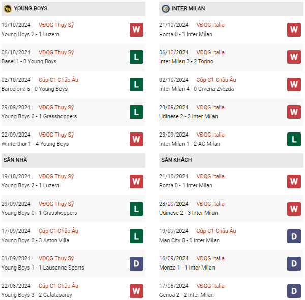 Thành tích đối đầu Young Boys vs Inter Milan: