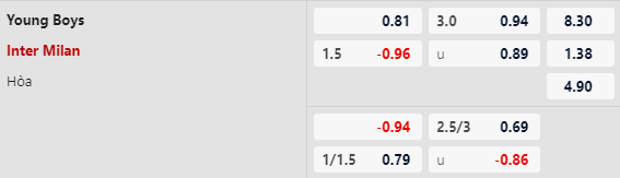 Đẳng cấp của Inter Milan rõ ràng vẫn vượt trội toàn diện so với đội chủ nhà. Do đó, dễ hiểu khi đại diện Serie A là những người được đánh giá cao hơn rất nhiều với kèo chấp -1 1/2. Phải hành quân đến Thụy Sĩ thế nhưng trong bối cảnh Young Boys đang chơi quá tệ và chạm đáy phong độ, sẽ chẳng ngạc nhiên nếu Inter Milan có thể thắng đậm ngay trên sân khách.